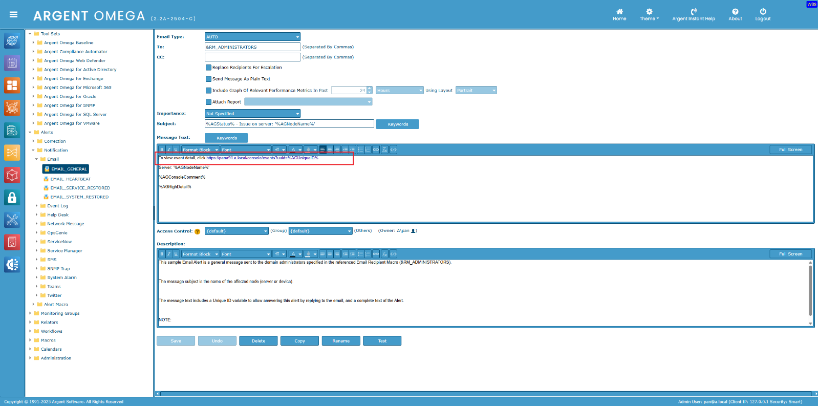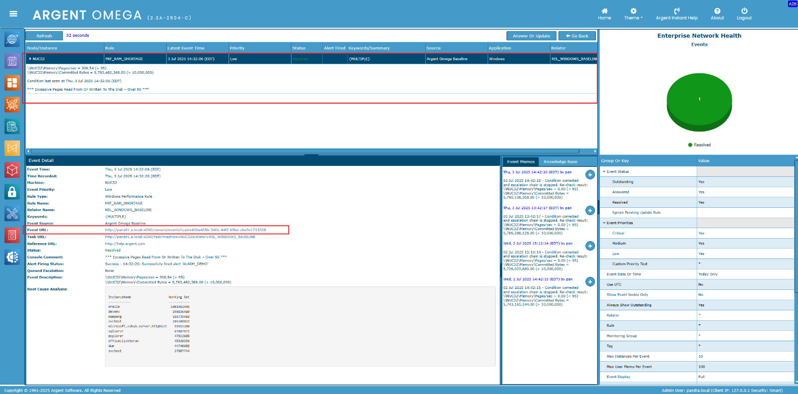 When the user clicks on the link, Argent Omega Event Console shows the single event.